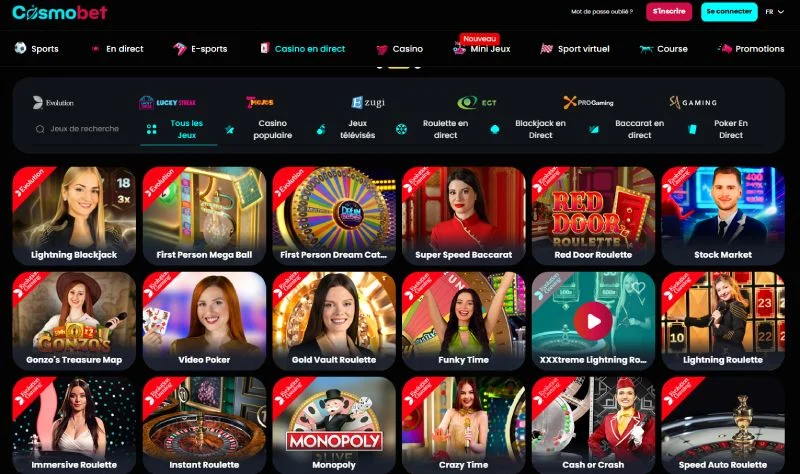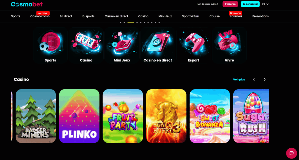 Cosmobet fonctionne comme une plateforme complète combinant plusieurs catégories de jeux.