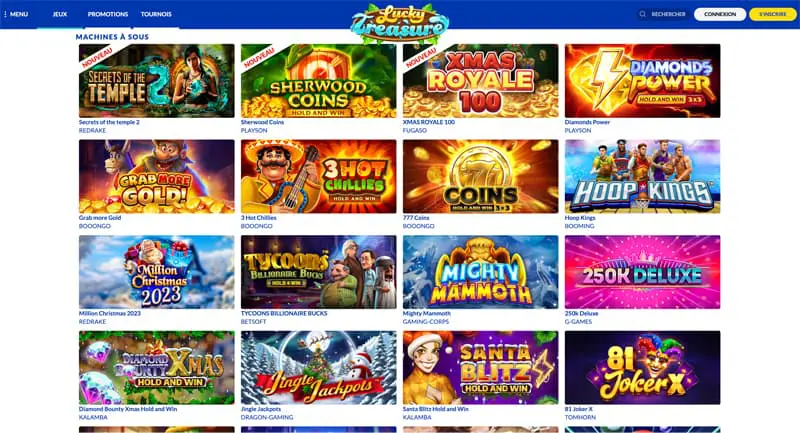 Ce point est important pour un avis Lucky Treasure Casino : on ne parle pas ici d’un simple “grand choix de jeux”, mais d’un catalogue multi-éditeurs, avec des studios reconnus et d’autres plus orientés volume.