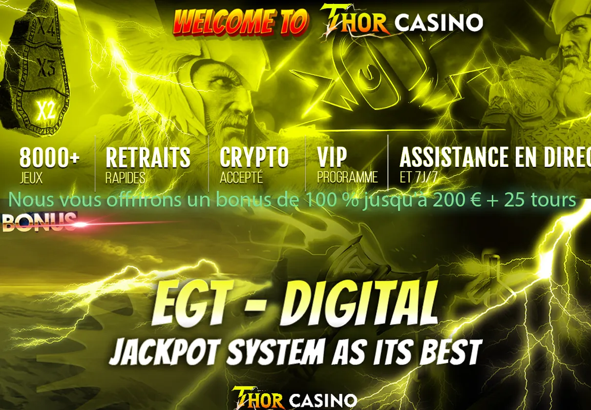Thor Casino se présente comme une plateforme internationale proposant plusieurs milliers de jeux, un live casino et différentes méthodes de paiement incluant les cryptomonnaies. L’offre promotionnelle est également mise en avant avec plusieurs bonus, dont un bonus sans dépôt exclusif permettant d’obtenir 20 free spins sans exigence de mise.